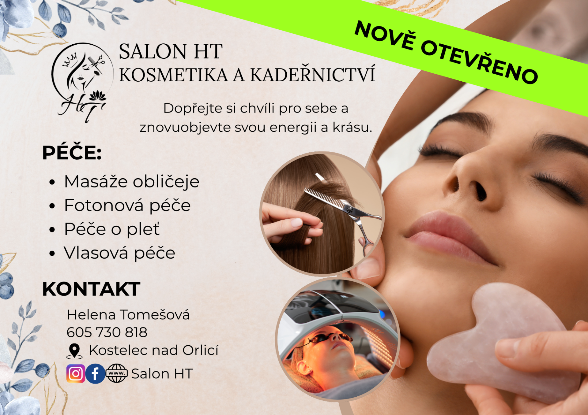 Vítejte v salonu Salon HT se specializací na masáže obličeje, péči o pleť a vlasy. Kosmetické a kadeřnické rituály pro vaši přirozenou krásu.